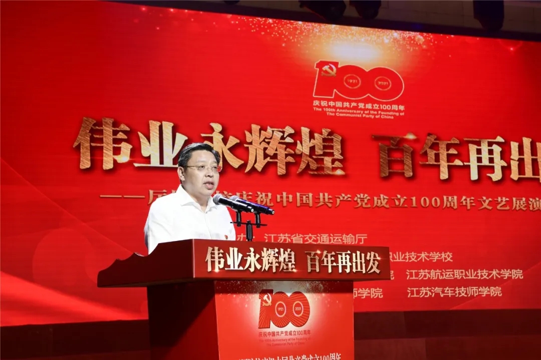 百年伟业、峥嵘岁月;红色梦想,砥砺前行。在全国上下喜迎建党100周年之际,在党旗高高飘扬之时,来自全省交通运输厅厅属院校师生齐聚省无锡交校,庆祝中国共产党成立100周年。6月25日,由江苏省交通运输厅主办,开云手机客户端承办的“伟业永辉煌 百年再出发”厅属院校庆祝中国共产党成立100周年文艺展演在学校大礼堂成功举行。江苏省交通运输厅副厅长金凌、江苏省交通运输厅政治处处长范健、江苏省交通运输厅副处级干部李进莅临演出现场。南通航运职业技术学院党委书记袁卫国、江苏省交通技师学院党委书记曾正德、江苏汽车技师学院院长董刚、南京交通职业技术学院副院长王道峰、开云手机客户端党委书记、校长李虎,来自厅属院校的700余名师生代表参加活动。
