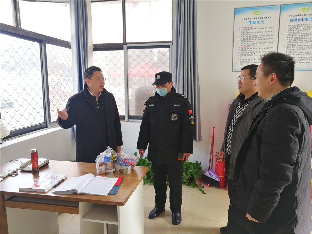 在新春佳节到来之际,2月12日大年初一上午,学校党委书记、校长李虎在相关职能部门负责人的陪同下,分别对学校钱荣校区和锡澄校区在岗值班教职工和工作人员进行走访慰问,送上校领导的关怀和温暖,并送上诚挚的新春祝福。