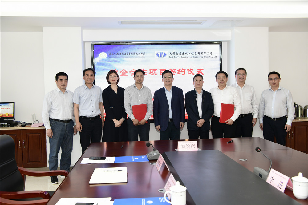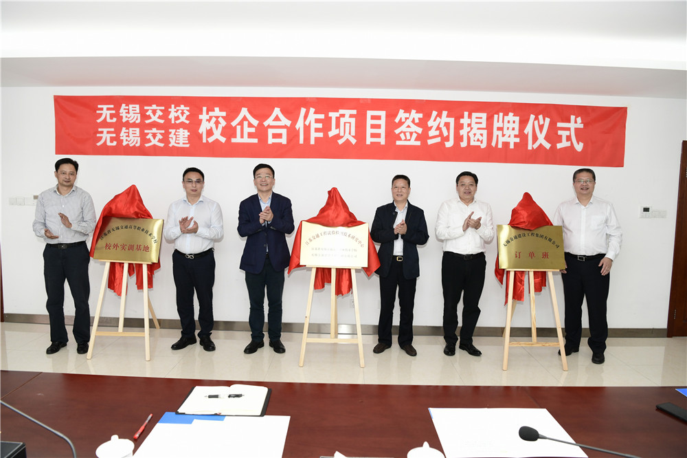 5月21日下午,学校与无锡交建集团举行校企合作项目签约、揭牌仪式。江苏省交通运输厅副厅长金凌,无锡市交通产业集团有限公司总裁王国新出席仪式并共同为“江苏交通工程试验检测技术研究中心”揭牌。厅政治处副处级干部李进,学校党委书记、校长李虎,无锡交建集团党委书记、董事长许青凯,总经理蒋豪分别为“无锡交通建设工程集团有限公司订单班”“江苏省无锡高等职业技术学校校外实训基地”揭牌。