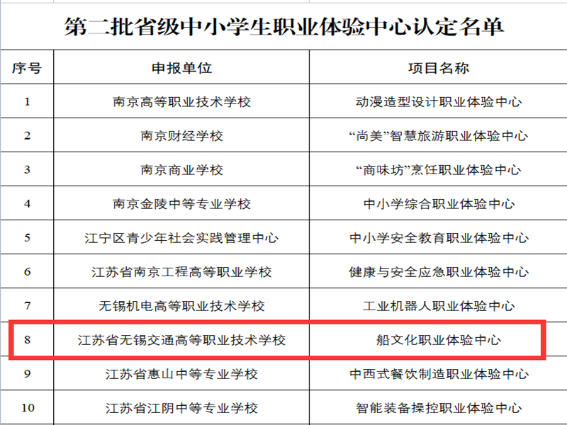 近日,江苏省教育厅发布《省教育厅关于公布第二批省级中小学生职业体验中心认定名单的通知》(苏教职函〔2021〕38号),学校“船文化职业体验中心”获评省级中小学生职业体验中心。