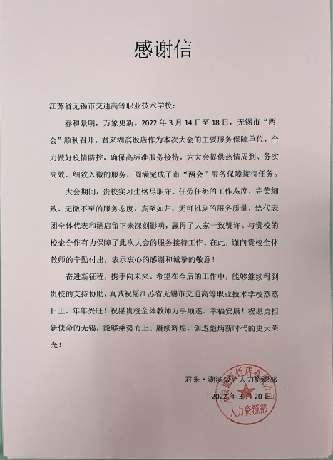 近日,无锡君来湖滨饭店向学校发来感谢信,高度赞扬学校实习生在市两会接待服务中的优异表现。会议期间,同学们以恪尽职守和任劳任怨的工作态度,热情周到、务实高效和细致入微的服务,圆满完成了市两会服务保障各项接待任务,学校学子扎实的服务技能和优异的专业素养,获得了参会代表、委员们的一致好评,使他们感受到服务的用心与温度。