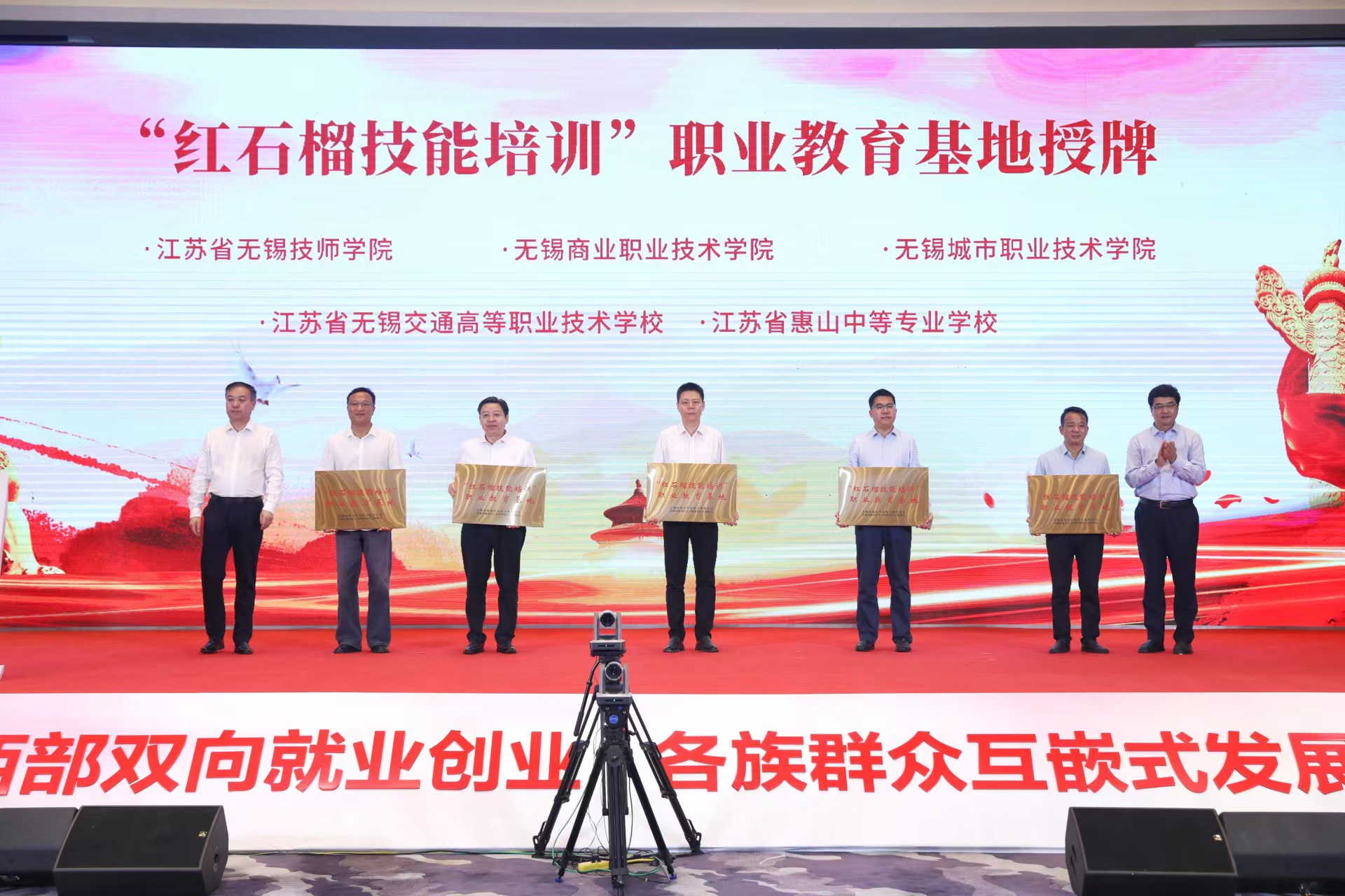 为进一步深化民族地区和东部地区的互助合作,优化多层次、多形式、全方位的合作格局,健全就业帮扶长效机制和稳就业措施,5月26日,江苏惠山与青海平安、青海乐都、贵州南明、云南元阳、西藏日喀则五省区联合举办“红石榴就业行动”推进会暨东西部劳务协作签约仪式。无锡市委常委、统战部部长周常青出席签约仪式并发表重要讲话。学校党委书记、校长李虎出席“红石榴就业行动”推进会暨东西部劳务协作签约仪式,并现场接受“红石榴技能培训”职业教育基地的授牌。