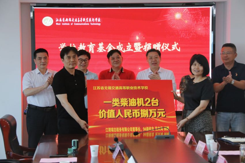 仪式上,无锡太湖教育基金会会长许益超表达了与我校合作的美好意愿,双方签订了学校教育发展专项基金合作协议;江阴瑞志船务有限公司董事长、94级校友范文海捐赠了价值8万元的一类柴油机2台。