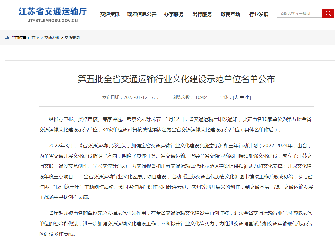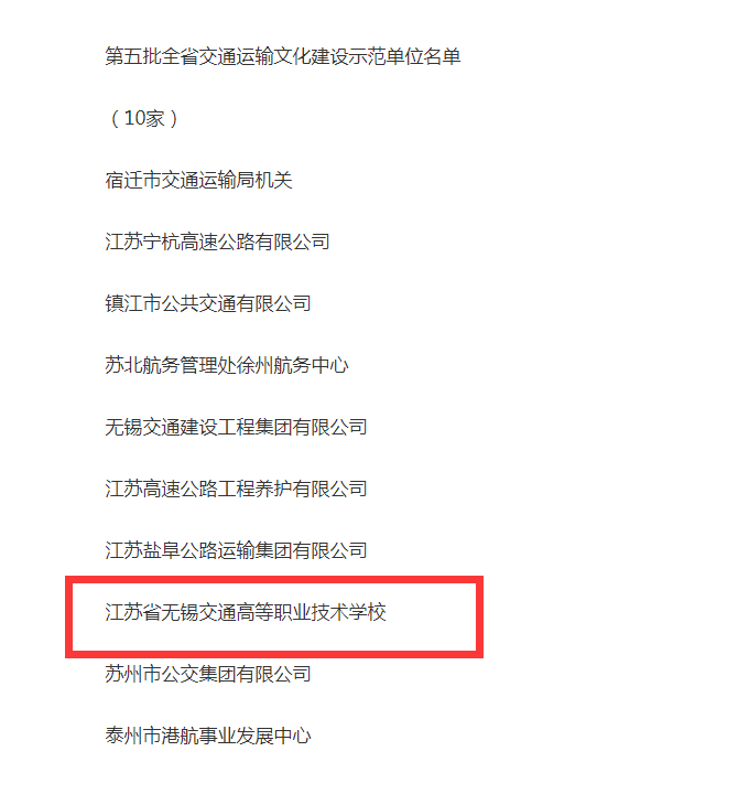 1月12日,省交通运输厅公布了第五批江苏交通运输行业文化建设示范单位,经推荐申报、资格审核、专家评选、考察公示等环节,学校获评全省交通运输文化建设示范单位。