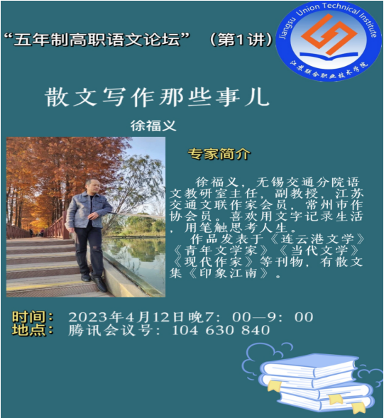 4月12日,基础教学部语文教研室徐福义副教授通过腾讯会议,在五年制高职语文论坛开展题为《散文写作那些事儿》的专题学术讲座。