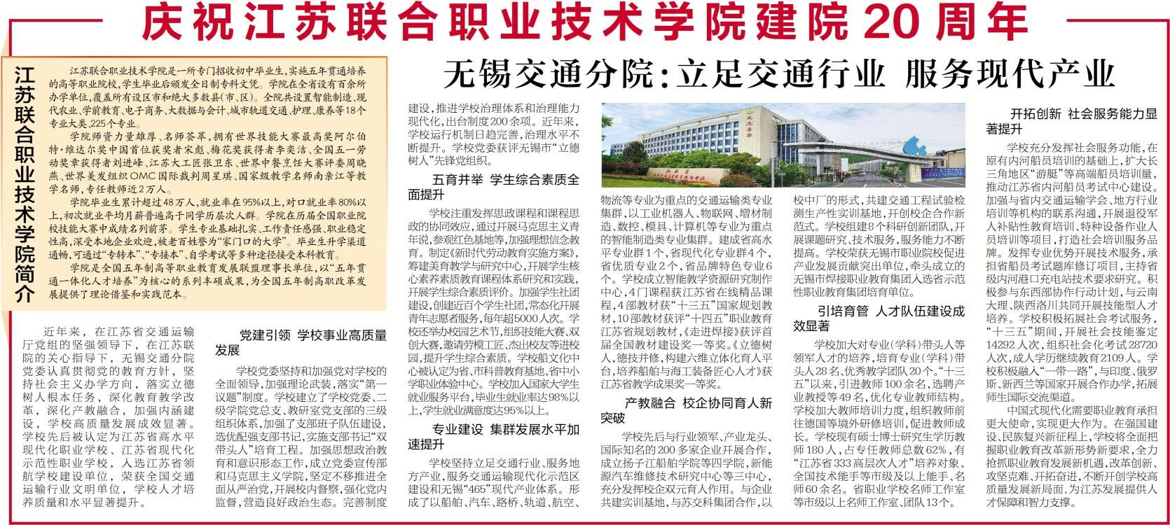 近年来,在江苏省交通运输厅党组的坚强领导下,在江苏联院的关心指导下,无锡交通分院党委认真贯彻党的教育方针,坚持社会主义办学方向,落实立德树人根本任务,深化教育教学改革,深化产教融合,加强内涵建设,学校高质量发展成效显著。学校先后被认定为江苏省高水平现代化职业学校、江苏省现代化示范性职业学校,入选江苏省领航学校建设单位,荣获全国交通运输行业文明单位,学校人才培养质量和水平显著提升。