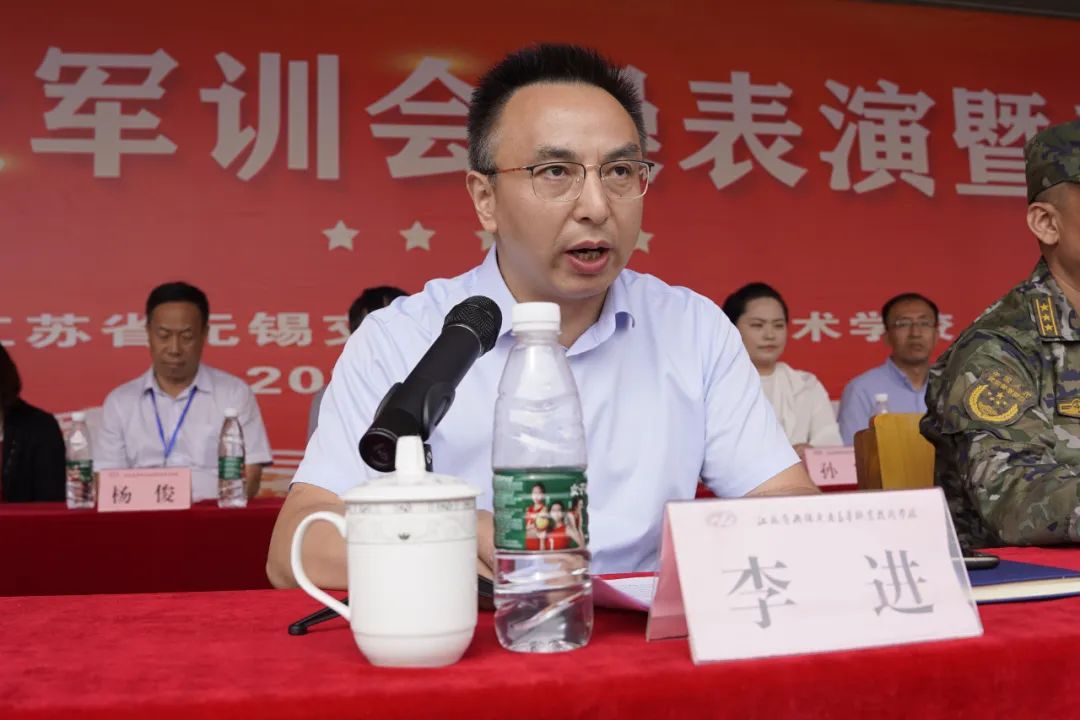 李进向承训部队赠送锦旗。他代表校党委向全体教官的辛苦付出表示衷心感谢,向全程跟训的辅导员老师、学生工作队伍表示亲切的慰问,向获奖的单位及个人表示热烈祝贺。他表示,同学们通过军训体会了军营生活,领略了军人的风采,激发了爱国热情,培养了吃苦耐劳、不畏艰难的精神品格,培养了集体主义观念和组织纪律观念,形成了团结互助的作风和积极向上的凝聚力、向心力。他对2023级新生提出三点希望,要学会坚持和忍耐,要学会吃苦和奋斗,要学会团结和协作。他希望同学们倍加珍惜,刻苦学习,培养良好的思想政治素质、职业道德、职业素质和职业能力,在学校的热土上耕耘青春、收获梦想。