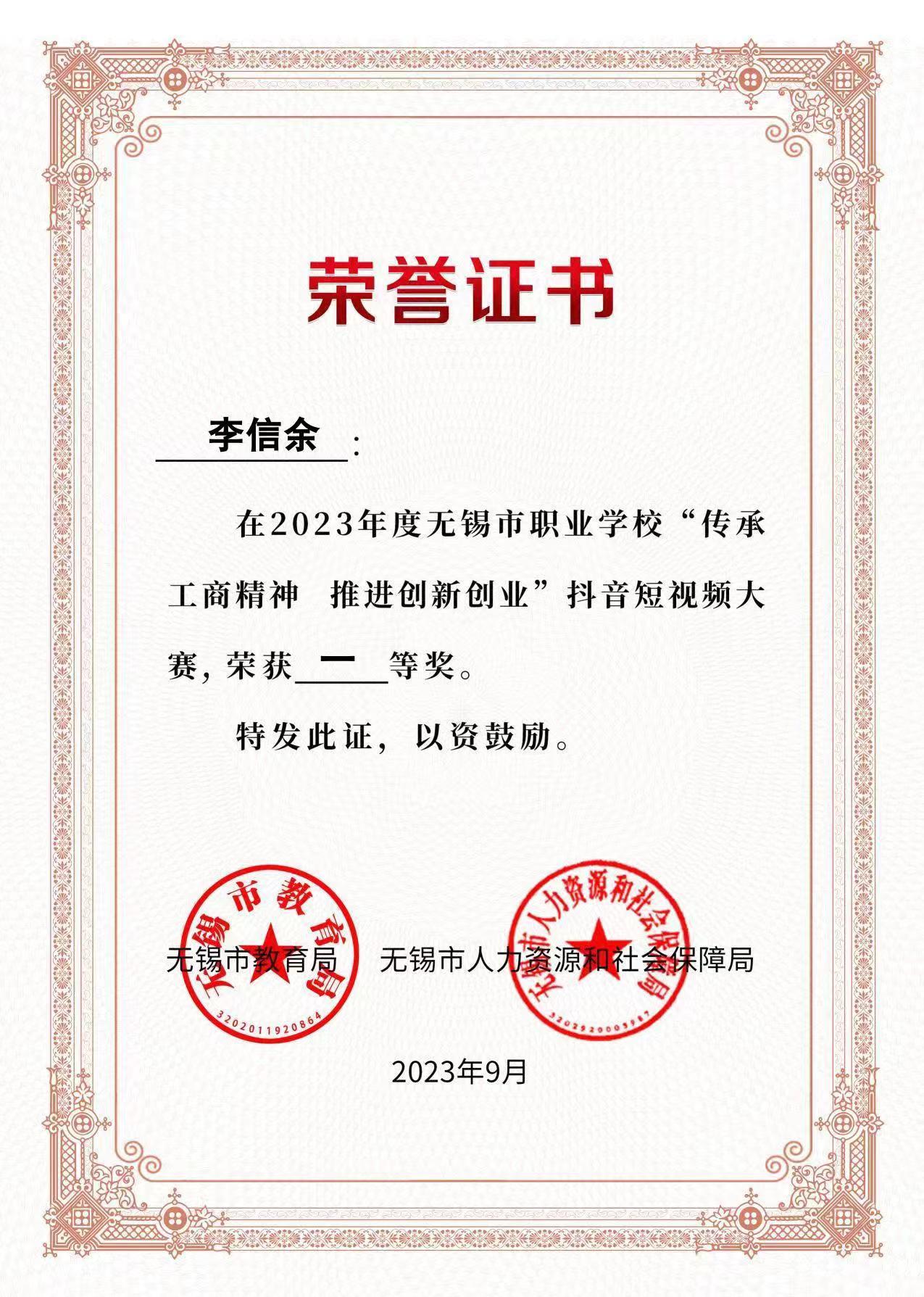 近日,在2023年度无锡市职业学校“传承工商精神 推进创新创业”抖音短视频大赛中,学校机电工程学院221341班学生李信余提交的短视频作品《传承与弘扬无锡工商业精神》脱颖而出,荣获一等奖!