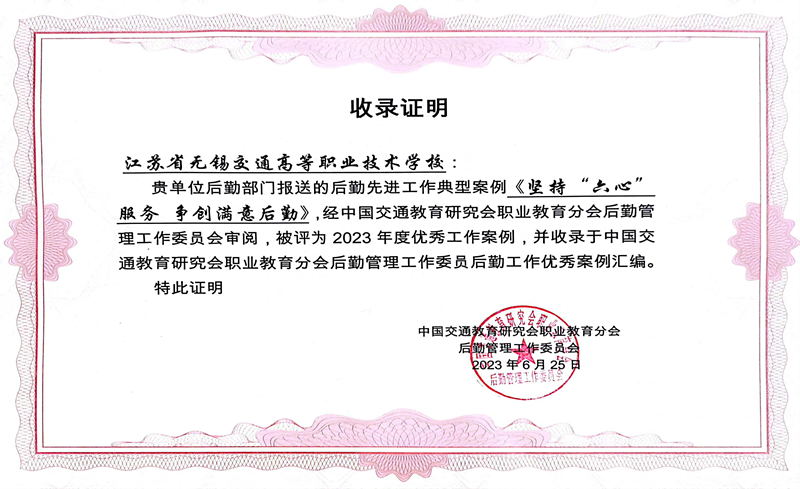 近日,中国交通教育研究会公布了2023年度后勤工作优秀案例评选结果。学校后勤管理处提交的《坚持“六心”服务 争创满意后勤》案例,从众多参评案例中脱颖而出,被评为本年度的优秀工作案例,并正式收录入中国交通教育研究会职业教育分会后勤管理工作委员会的后勤工作优秀案例汇编。