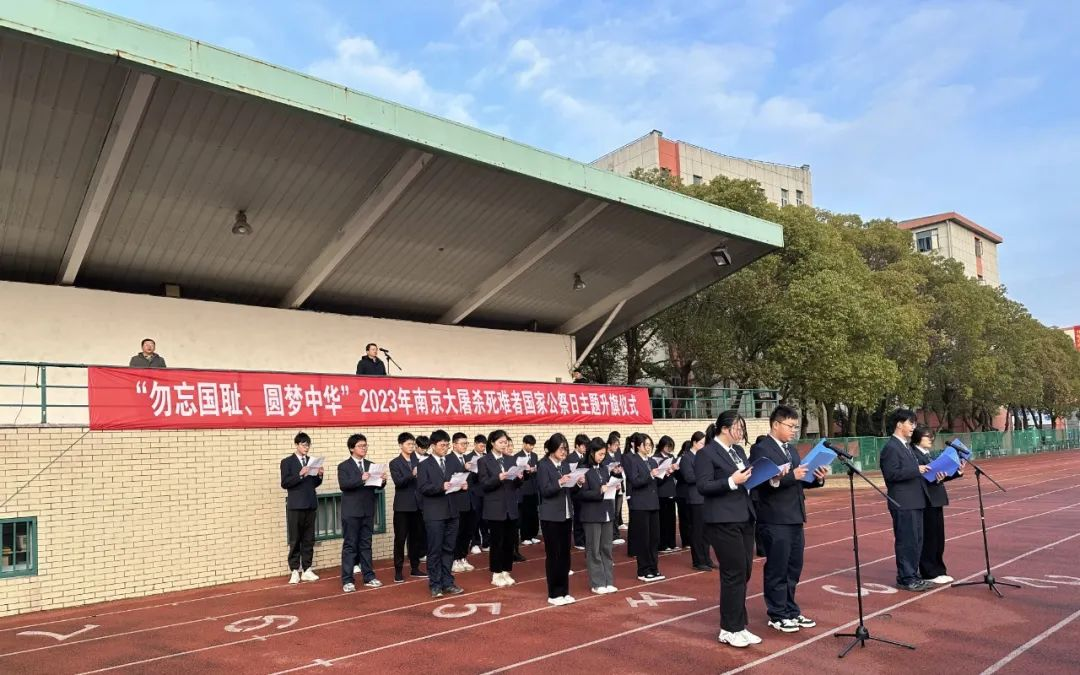 7点30分,主题升旗仪式正式开始。伴随着嘹亮的《歌唱祖国》,着装严整的国旗仪仗队齐步出场,他们步伐铿锵,目光坚毅,脚下走过的是短短的距离,心中刻下的却是不可磨灭的历史印迹。伴随着庄严的中华人民共和国国歌《义勇军进行曲》,现场师生共唱国歌,向国旗行注目礼,注视着五星红旗冉冉升起,表达了对党与祖国的无限热爱。国旗升起后又徐徐降下,时间在此刻定格,我们降半旗致哀,悼念同胞。现场师生向南京大屠杀的无辜死难者、向所有惨遭日本侵略者杀戮的死难同胞,向为中国人民抗日战争胜利献出生命的革命先烈和民族英雄默哀,现场师生沉浸在追思同胞、反思历史、勿忘国耻的氛围中,表达了对革命先烈的无限哀思和崇高敬意。