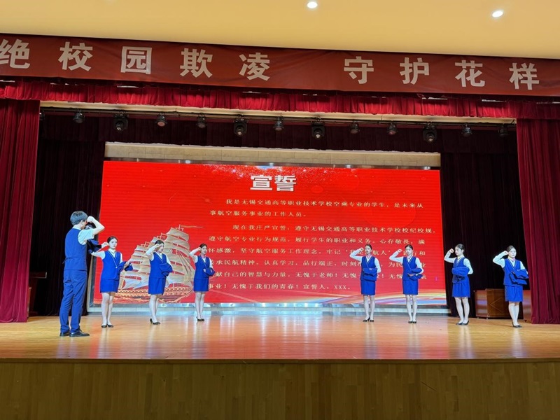 空乘制服凝聚着专业标准与规范,体现着航空职业的特殊性。为了培养学生对航空专业的认同,强化对未来职业的认知,4月17日下午,学校在大礼堂隆重举行2023级航空专业授装仪式。船舶工程学院院长吴志亚、党总支书记赵斌、副院长刘方及航空教研室全体老师、班主任参加了本次授装仪式。仪式在庄严的国歌声中拉开序幕。