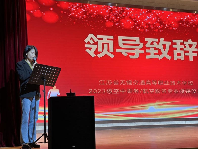 首先由船舶工程学院院长吴志亚上台致辞。吴院长对2023级航空服务、空中乘务专业的学生入校后的表现给予肯定;同时指出穿上航空制服意味着承担的责任与义务,希望同学们在今后学习生活中要维护职业形象,恪守职业道德,加强自身修养,争做合格的“民航人”。