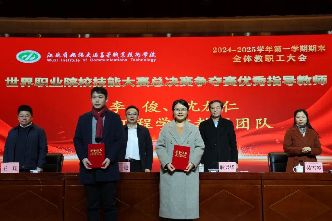 学校党委委员、副校长吴雪琴宣读2024年学校“十件大事”。全面回顾了学校在过去一年的奋斗足迹。会上还表彰了省级以上荣誉获奖教师和团队。校领导为他们颁发获奖证书和铜牌。来自处室、学院的优秀教职工代表作交流发言,分享了在专业建设、技能竞赛以及工作中的优秀经验和做法。