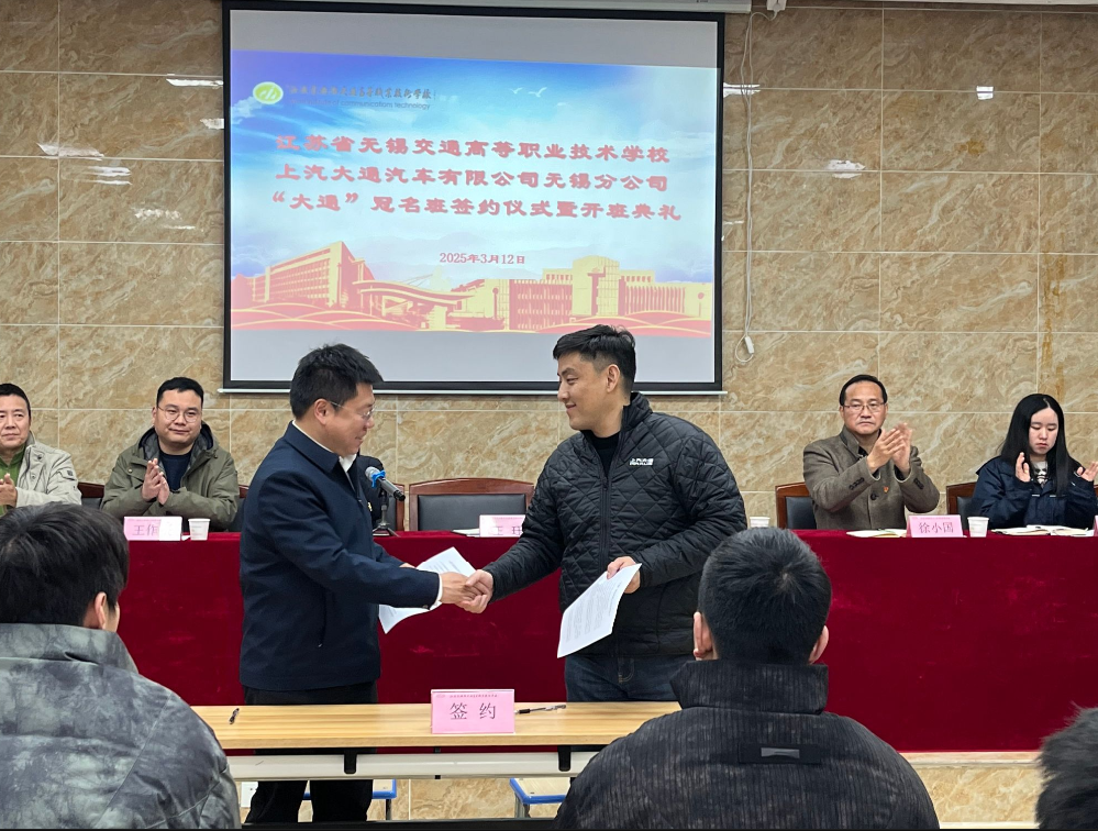 会上,学校和上汽大通无锡分公司签署了冠名班合作协议。211231班学生高吉林代表冠名班全体同学作表态发言。