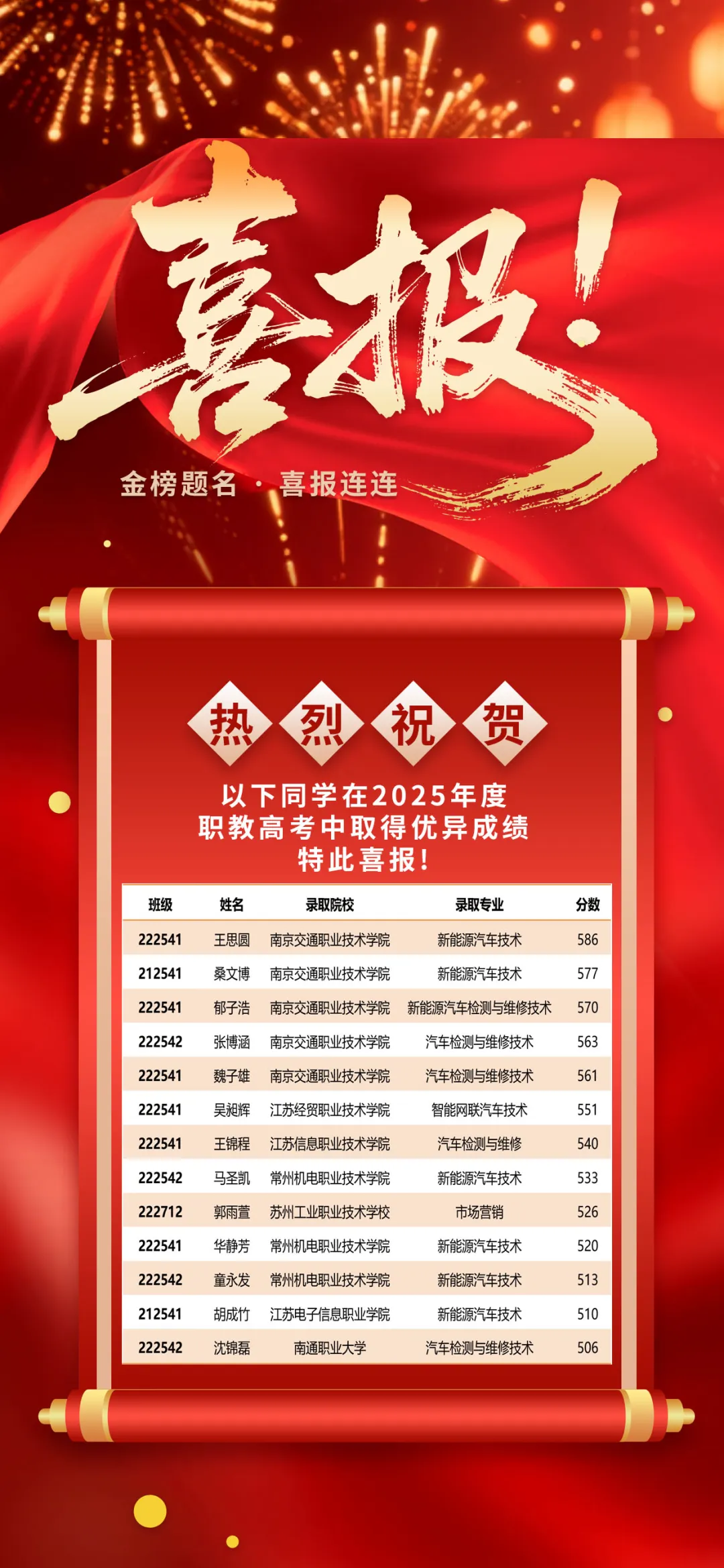 又一年职教高考录取季,学校2025年江苏省职教高考整体成绩显著提升,543名中职学子(包含现代职教体系项目学生)相继被江苏信息职业技术学院、南京交通职业技术学院、无锡科技职业学院、常州工业职业技术学院、江苏城乡建设职业学院等多所高职院校录取,校园里处处洋溢着愉悦的气氛。