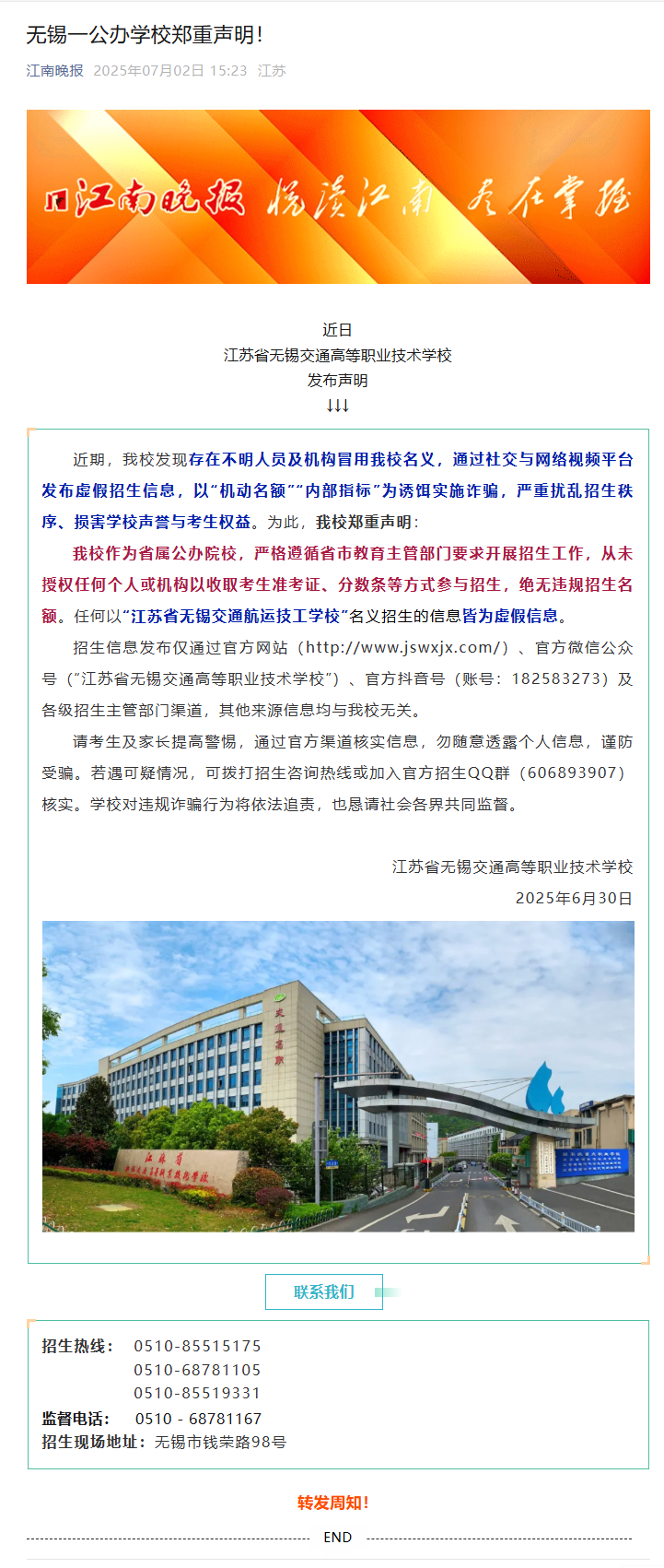 江南晚报:无锡一公办学校郑重声明!