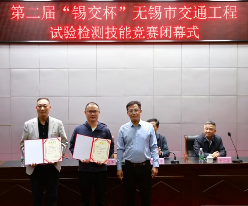10月20日下午,第二届“锡交杯”无锡市交通运输系统职工交通工程试验检测技能培训及技能竞赛在我校学术报告厅顺利闭幕。本次活动由无锡市交通运输局主办,参加仪式的有副局长周冠华、陈昌伟四级调研员、王立新主席、建管处处长吴达卫,学校耿兴华副校长及学校交通工程学院领导、参赛的十四支代表队共五十余名选手参加闭幕式。