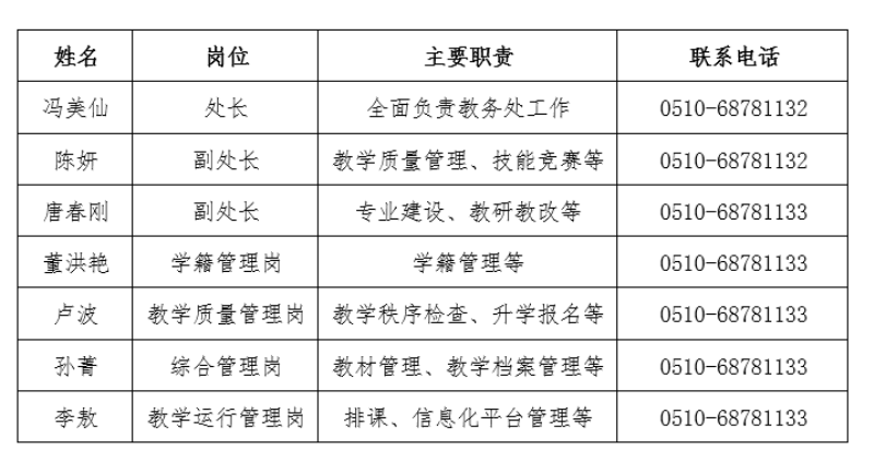 教务处是在校长和分管教学的领导指导下开展工作,是学校教学工作的组织、协调、管理的综合职能部门。主要负责制定学校教学工作计划、组织开展专业建设和教师业务考核评教活动、对二级学院(部)教研室进行业务指导;负责学生学籍管理、考务管理、技能竞赛管理、学生成绩管理,统筹协调中高职衔接“立交桥”及有关升学教育的工作,负责组织各类教学竞赛、师生技能比赛等工作。