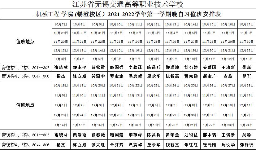 机械工程学院2021-2022第一学期晚自修值班表
