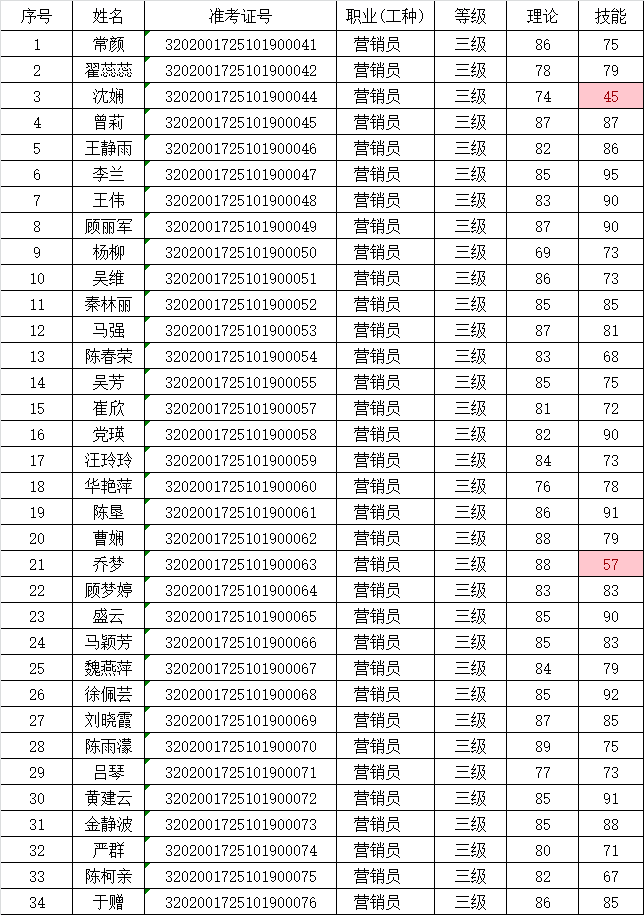 2025年10月19日,34名企业人员参加营销员三级技能等级认定考试(考试批次:2024-32020017-00036),共计32名成绩获得合格。现将考试成绩公示如下: