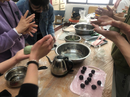 活动伊始,社团指导老师通过知识问答、讲故事的形式,讲解了清明节的由来、本地的清明节习俗以及有关清明节的传说,让社团成员懂得传承中华民族优秀文化的重要性。接着,指导老师口头讲解制作青团的方法,并在QQ群中分享了具体的步骤。社团成员纷纷动手,揉面团、加青汁、加豆沙,活动室里一派热闹景象。人多力量大,没多久,青团做好了。一个个整齐地摆放在盘子里。蒸一蒸,清香之味扑鼻而来,社团成员带着笑容品尝自己的劳动成果,自豪之情溢于言表。