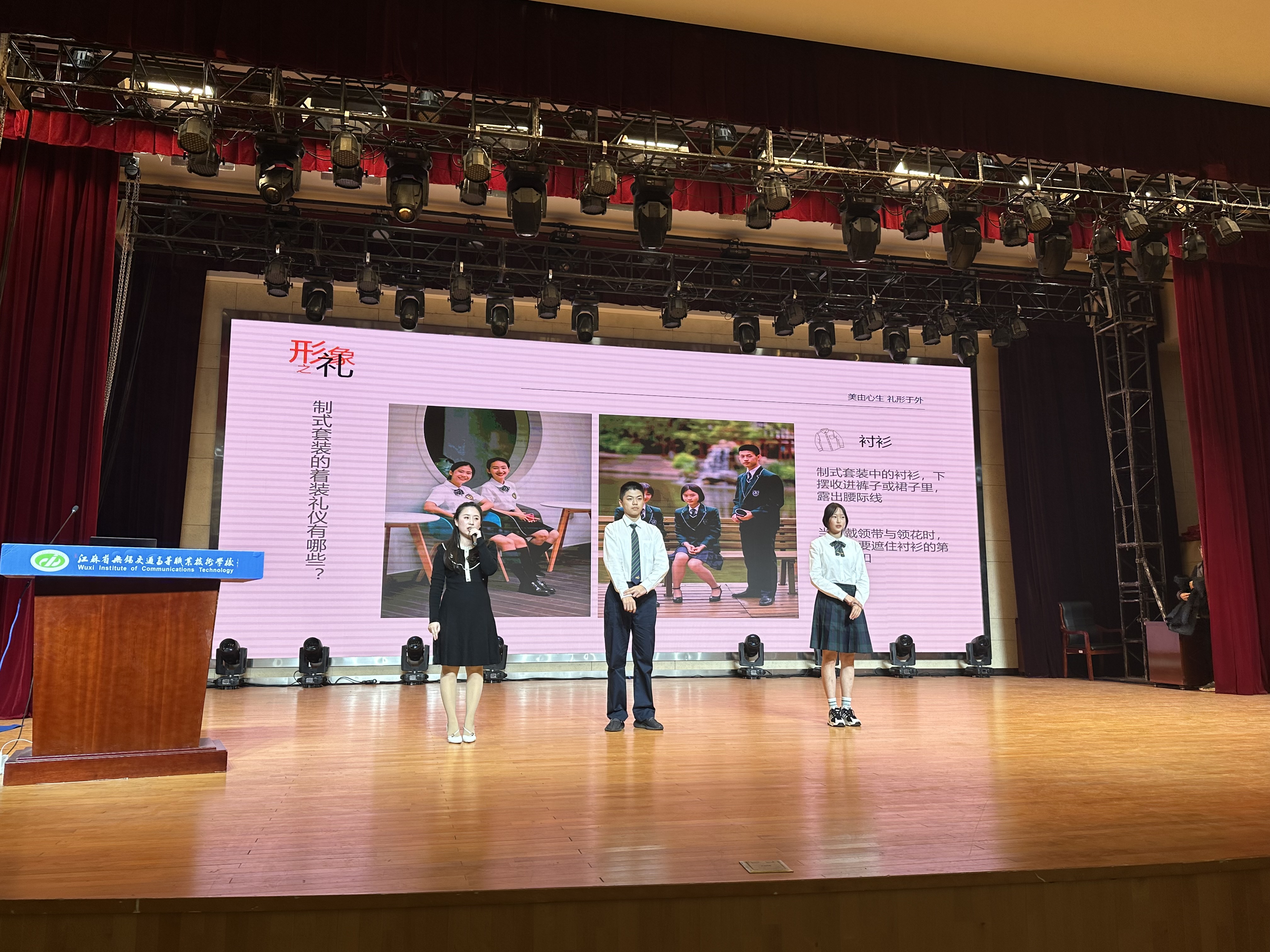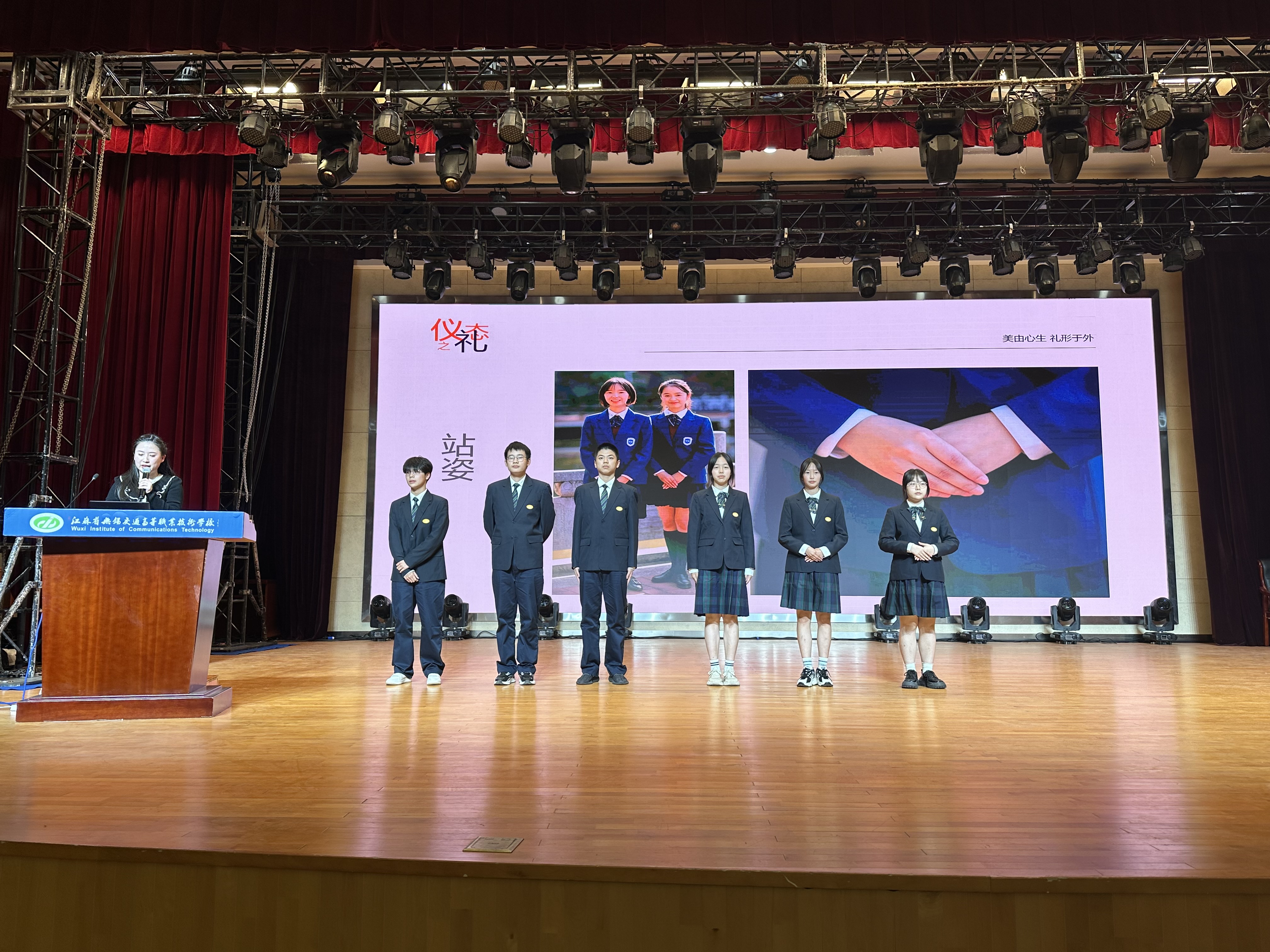 “不学礼,无以立”,为进一步丰富学生的着装礼仪知识,切实提高学生的文明礼仪素养,11月15日下午,学校在大礼堂开展了“美由心生 礼行于外”学生礼仪培训讲座。讲座邀请到了学校校服供货商江苏伊顿纪德品牌有限公司的美育礼仪师江馨老师,全校600余名学生参加了此次培训讲座。本次讲座由学生工作处副处长籍鑫慧主持。