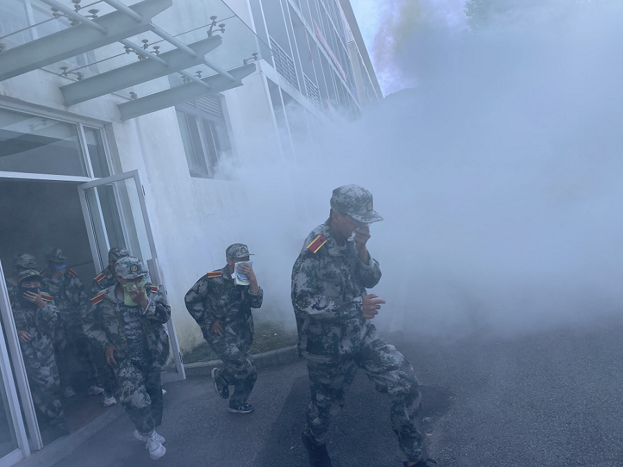 下午两点三十分,随着校园内火灾警报声的响起,教室内的学生在老师的指导和教官的带领下弯着腰、毛巾捂住口鼻沿着学校指定路线有序撤离到学校操场。