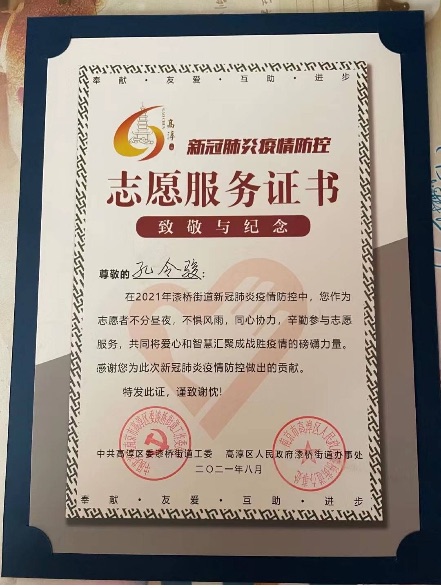 此次志愿服务也让平时生活在象牙塔的我们感受到深深地震撼,无数医护人员、工作人员舍小家为大家,坚守岗位,大爱无疆,我们要向奔赴一线疫区最美的逆行者致敬,向所有为抗疫做出贡献的人致敬,我们一定会风雨无阻,战胜疫情。南京加油!扬州加油!中国加油!