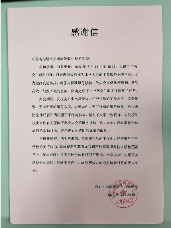 3月20日,无锡君来湖滨饭店向我院发来感谢信,衷心感谢船舶工程学院实习生在无锡市“两会”召开期间提供热情周到、务实高效、细致入微的服务,圆满完成了市“两会”服务保障接待任务。