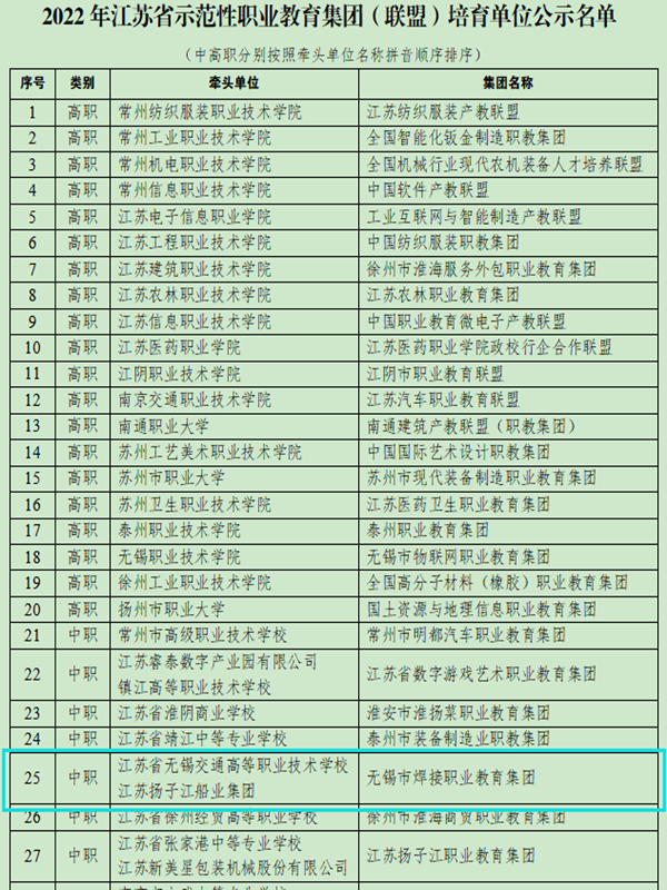 12月19日,江苏省教育厅公布了2022年江苏省示范性职业教育集团(联盟)培育单位遴选结果,经学校申报、专家评审,我校牵头组建的无锡市焊接职教集团获批江苏省示范性职业教育集团(联盟)培育单位。