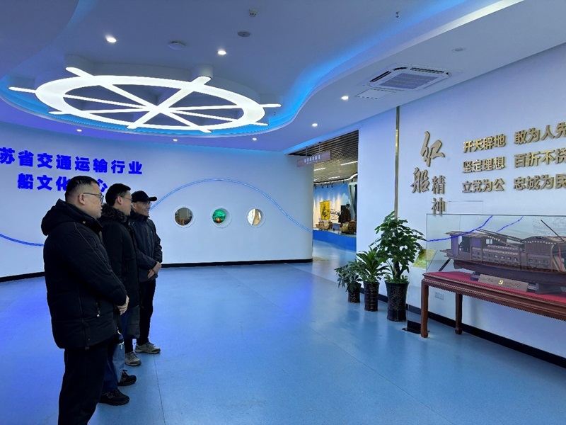 2024年1月31日江苏省综合交通运输学会学术交流部副部长谢卫奇带队,由船舶工程学院院长吴志亚、学院党总支书记赵斌陪同,对首批优秀交通科普教育基地我校“江苏省交通运输行业船文化中心” 进行现场考察。