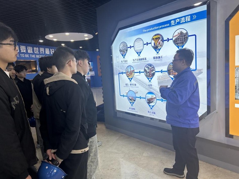 在企业专家的带领下,我校师生首先参观了厂区船坞、船台及各个车间,直观学习到了各个船舶分段,并了解了目前企业主要在建船型,使学生深刻学习到了造船流程。随后,学生们登上了一艘5万吨成品油船,分别参观了机舱、甲板、驾驶台等区域。企业专家非常细致地给学生讲解了主机、发电机、锅炉、制冷装置、轴系等重要的机舱设备,并介绍了部分技术非常先进的新设备,让学生学习到了很多在课堂中难以获取的新知识,拓宽了专业知识面。最后,企业专家为我校师生介绍了扬子江集团的企业文化、已建造的典型船舶、企业发展愿景等。企业也非常热情地表示,后续会进一步加强和我校的合作,共育高素质船业人才。