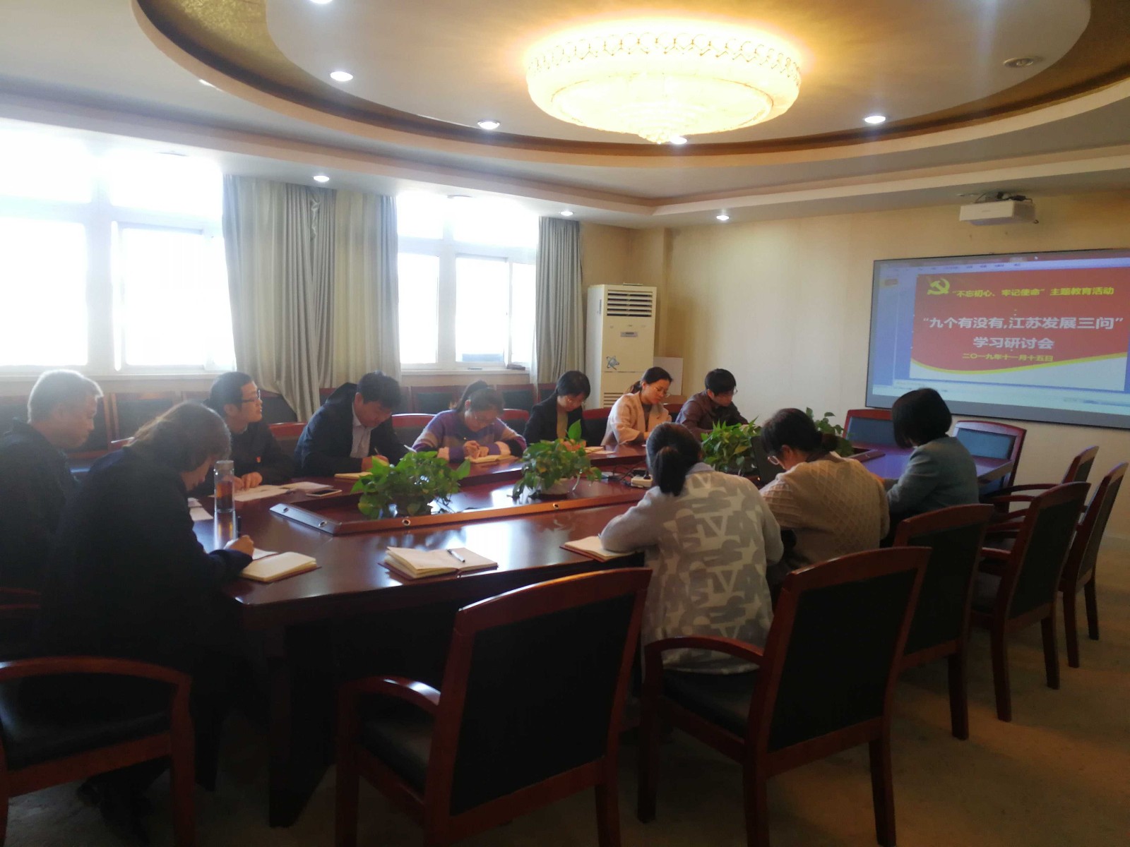 2019年11月15日中午,根据学校“不忘初心、牢记使命”主题教育安排,船舶工程学院党总支组织了学院的全体党员和积极分子在学院会议室召开了“九个有没有,江苏发展三问”学习研讨会。
