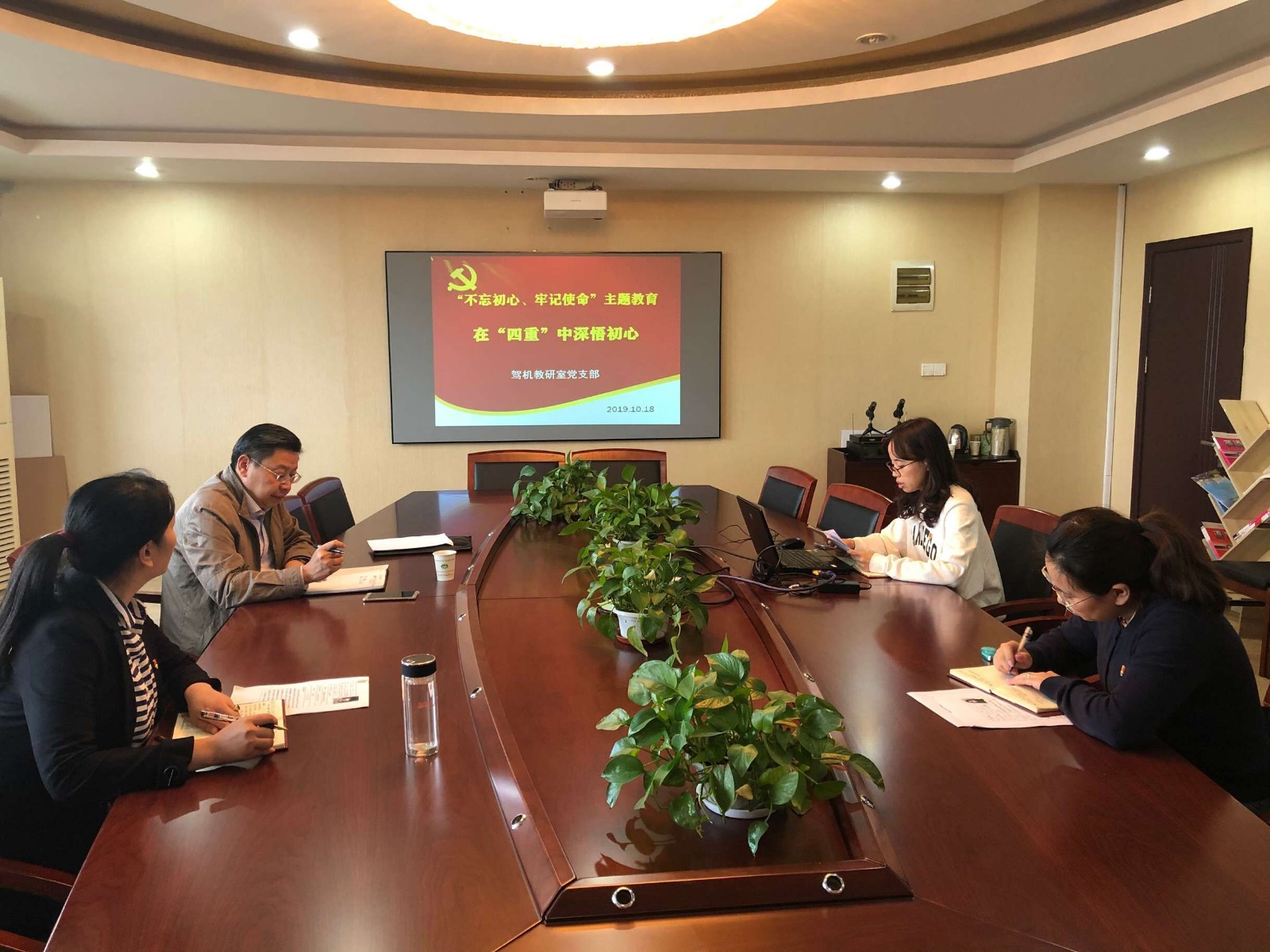 为教育引导党员坚守初心使命,勇于担当作为,充分发挥先锋模范作用,10月18日,驾机教研室党支部在船舶工程学院党员活动室组织开展了“不忘初心、牢记使命”主题教育——在“四重”中深悟初心活动。本次活动由支部书记沈丽兰主持,支部党员李虎同志、刘方同志、蒋俊敏同志均参与了本次活动。