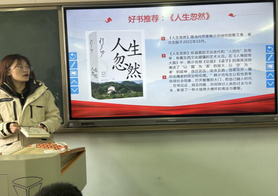 会上,江文歆老师按“总书记的青年观”“习近平新时代中国特色社会主义思想”“座谈交流”“好书推荐”等四个部分进行宣讲,同学们踊跃发言、积极参与讨论。活动推荐的作品是韩少功的《人生忽然》,该书用《论语》《孟子》的典故深刻阐述了“以‘国’为‘家’的放大,以‘忠’为‘孝’的延伸,由近及远,由亲及疏,由里及外,编织出儒家的政治和伦理。