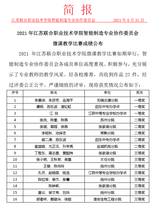 在刚刚结束的2021年江苏联合职业技术学院微课教学比赛中,由学校机械工程学院李慕译、朱芬芳、巫海平3位教师制作的微课被江苏联合职业技术学院智能制造专业协作委员会评为一等奖。