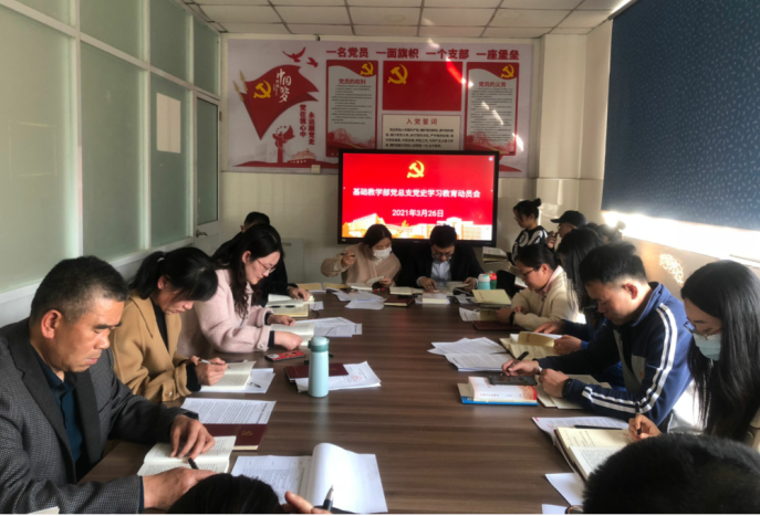 3月26日下午,基础教学部党总支在部门会议室开展党史学习教育,部门全体党员参加会议,会议由基础教学部党总支副书记杨凤琴主持。