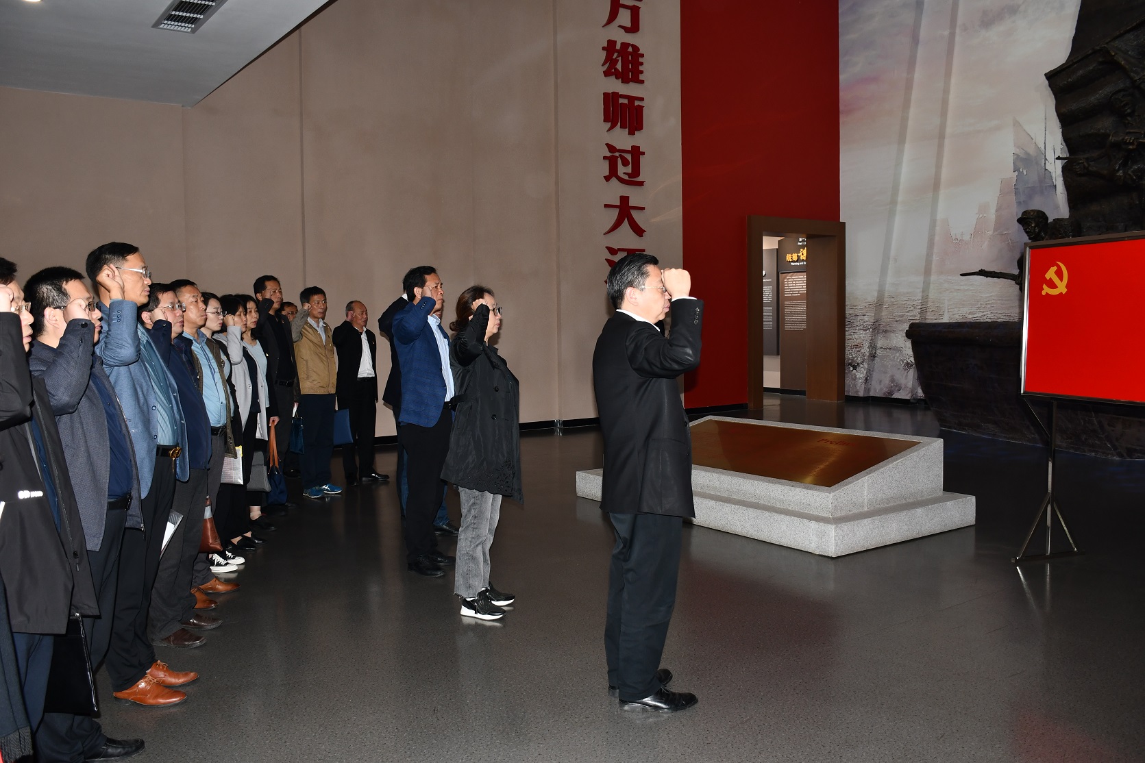 “我志愿加入中国共产党,拥护党的纲领、遵守党的章程……”在渡江战役纪念馆前,面对鲜艳的党旗,党委书记李虎带领党委理论学习中心组成员重温入党誓词,重忆入党初心。铿锵恢宏的誓词,强烈震撼着在场的每一位党员,一字一句,神圣而豪迈,铮铮誓言,体现了党员同志们对中国共产党的无限忠诚,坚定了入党使命,奋斗初心。