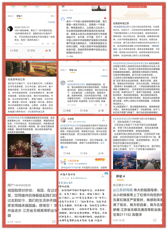 我在祖国怀里成长,我为祖国祝福。以网为媒,学生参与江苏自媒体联盟在微博等网络平台开设的“红色百年话江苏”话题活动,把对伟大祖国的热爱和祝福在互联网上高高飘扬。