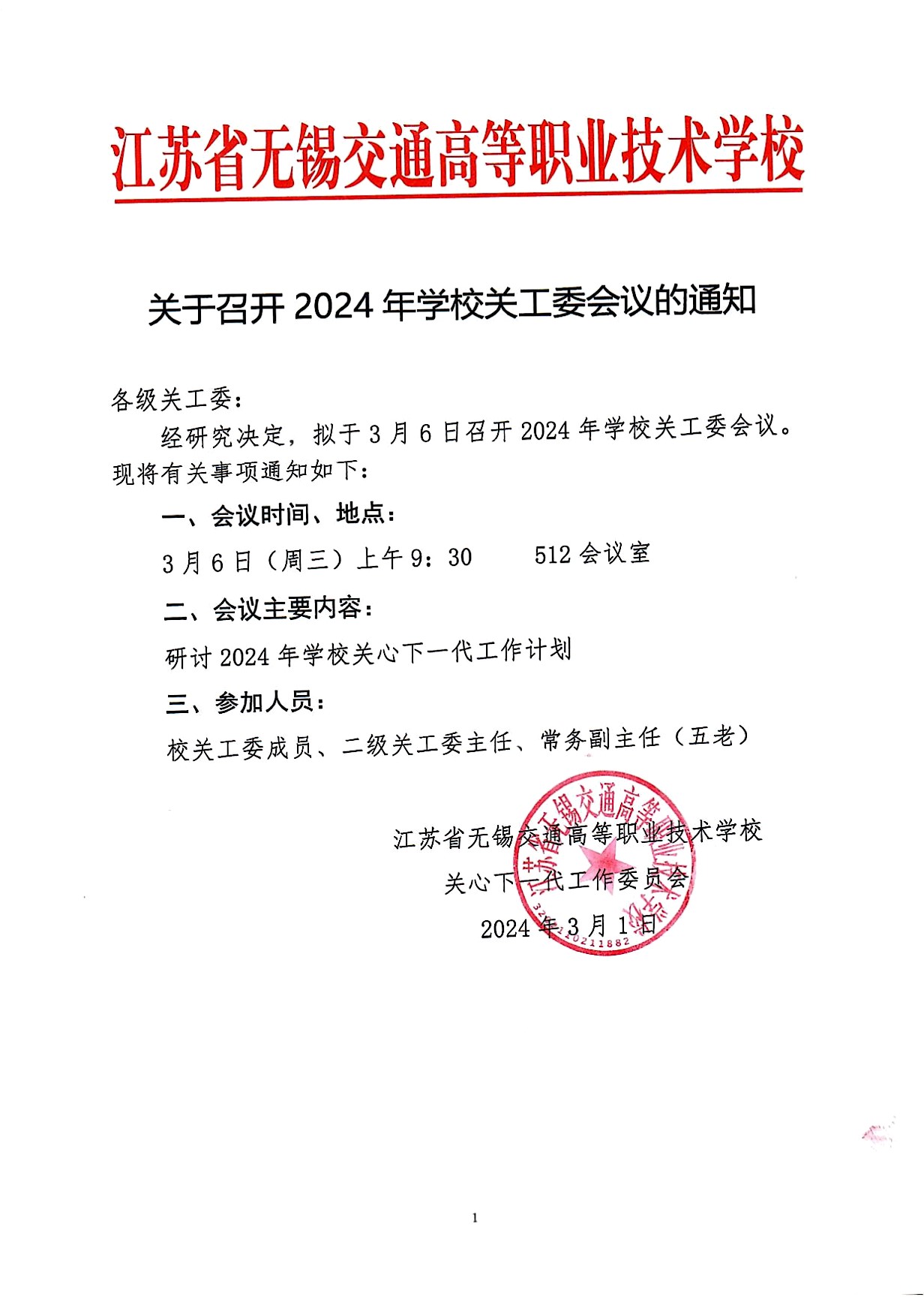 3月6日召开校关工委工作会议通知