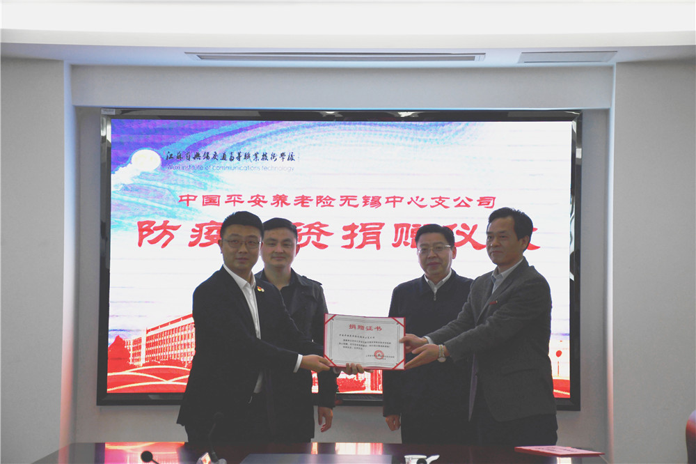 4月23日,学校举行防疫物资捐赠仪式。会上,中国平安养老险无锡中心支公司为学校捐赠10000只口罩,无锡市教育局高职处副处长蔡锦山、中国平安养老险无锡中心支公司党支部书记谢琨、开云手机客户端党委书记李虎出席会议。