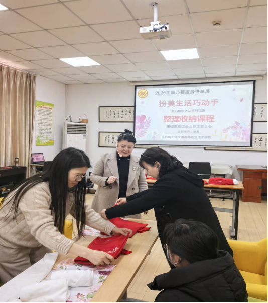 理论讲解之后,在老师的指导下,在场的女职工纷纷动手实操了三秒叠衣法、口袋收纳法等多种收纳技巧,体验了整理收纳的乐趣。通过此次活动,进一步增强了女职工的生活技能,疏解了在教育教学中累计的精神压力,更激发了大家对美好生活的向往与追求。