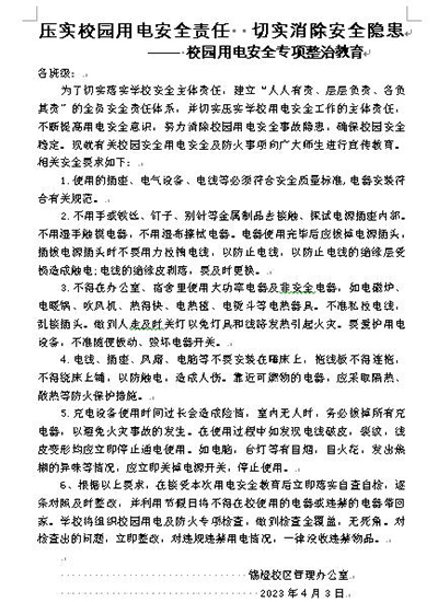 专项检查前,锡澄校区管理办公室在4月6日认真学习文件要求后,编制了《压实校园用电安全责任 切实消除安全隐患 ——校园用电安全专项整治教育》的文字材料,用于在班会课上对学生进行安全警示教育。还利用校园广播站播报校园用电安全知识、升旗仪式进行安全主题讲话,集中向全体师生宣讲校园用电安全,进一步明确校园用电安全的重要性。