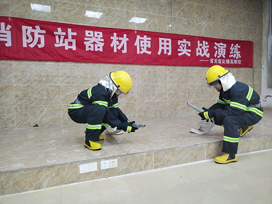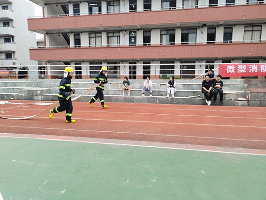 活动中,首先各位班级安全员在室内场地分别进行了消防专用防护衣裤、头盔、消防靴、隔热手套正确穿戴的演练;其次,在全副防护穿戴的情况下进行消防水龙带和枪头的连接;第三,进行模拟手持干粉灭火器灭火过程;最后,各班级安全员在操场跑道进行着防护服行进间连接水龙带和枪头,并模拟灭火器灭火过程。在两人对抗赛中,同学们一丝不苟,按照规范动作,你追我赶认真演练消防器材的使用,同时赢得了观摩师生的喝彩和热烈掌声。