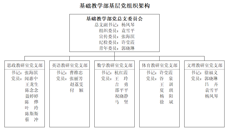 基础教学部党总支下设思政教研室党支部、英语教研室党支部、数学教研室党支部、体育教研室党支部、文理教研室党支部。