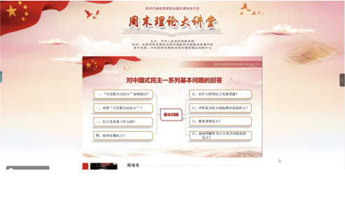 我院20名思政教师聆听了陈培永教授主讲的“全过程人民民主与中国式民主理论的系统构建”课程。这堂课让我们深刻认识到民主是全人类的共同价值,是中国共产党和中国人民始终不渝坚持的重要理念,这对我院教师如何上好有关“中国特色社会主义民主的鲜明特征与显著优势”的思政课有着启发性影响,提高了我们理论教学水平。