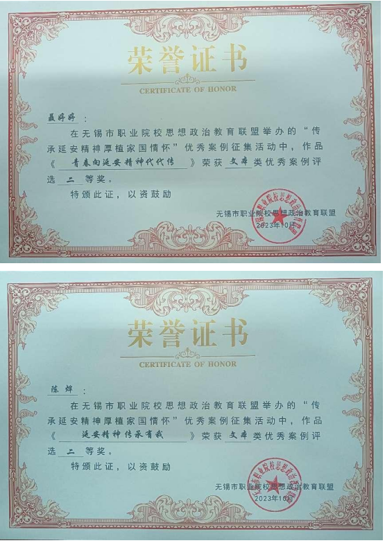 近日,在无锡市职业院校思想政治教育联盟举办的“传承延安精神 厚植家国情怀”优秀案例征集活动中,王龙生提交的参赛作品《论延安精神的科学内涵、理论来源和实践路径》、聂婷婷《青春向延安 精神代代传》、陈烨获提交的参赛作品《延安精神 传承有我》均获得文体类二等奖。
