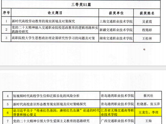 王龙生、李理荣获2023年度中国交通教育研究会职教分会思政工作论文评比三等奖。