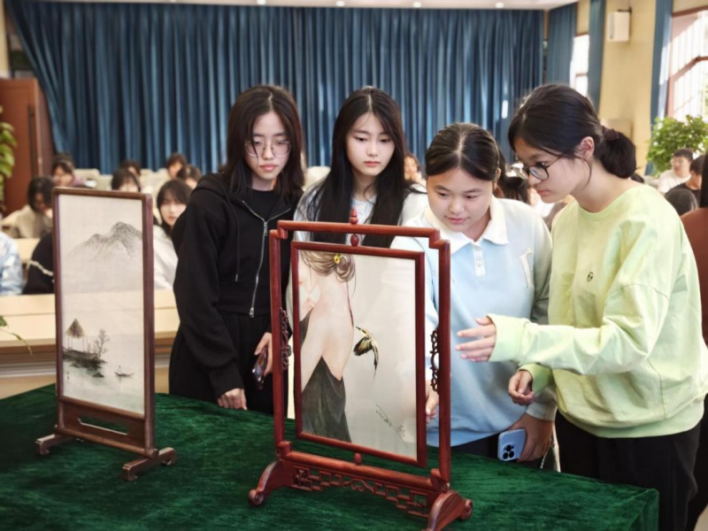 鲍文姬还现场展示了精微绣的制作过程,那精湛的技艺让同学们赞叹不已。在学生体验环节,同学们在鲍文姬的指导下,亲自感受了精微绣制作的魅力,将传统文化的种子种在了心间。互动交流环节,同学们积极提问,与鲍文姬深入探讨关于精微绣的知识,分享自己的体验感受。