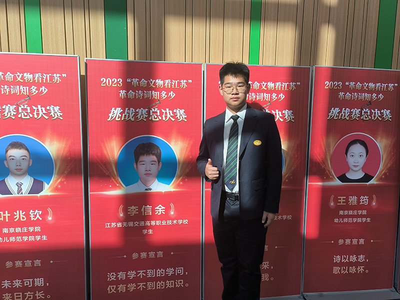 赓续历史文脉,谱写当代华章。11月21日,2023“革命文物看江苏”革命诗词知多少挑战赛总决赛在南京机电职业技术学院青春剧场举办。活动由江苏省文物局、共青团江苏省委、新华报业传媒集团主办,新江苏客户端·中国江苏网、“学习强国”江苏学习平台、南京机电职业技术学院承办。机电工程学院李信余在本次活动中荣获一等奖。